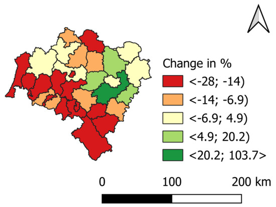 An analysis of the population of Lower Silesian counties indicates that during the period 1995–2023, a decrease in population was recorded in the majority of counties (22 out of 30). The percentage change in population between the beginning and end of the indicated period is shown in Figure 4. The classes were determined according to Jenks’ rule. The predominance of the counties surrounding Wroclaw over the other counties in the studied region is clear; green color indicates population growth. Unfortunately, all cross-border counties are significantly affected by depopulation (shades of red).