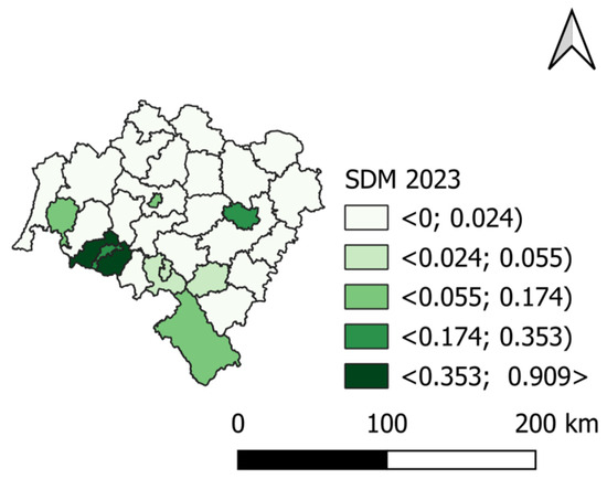 SDM—level of realization of tourism function in 2023. Source: own compilation in QGIS program.