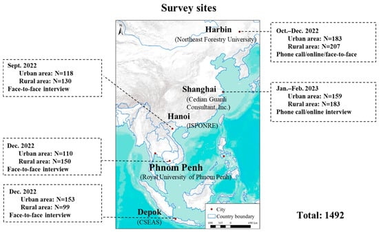The survey was conducted between September 2022 and February 2023 across five cities in four Asian countries: in Hanoi (Vietnam) in September 2022, Phnom Penh (Cambodia) and Depok (Indonesia) in December 2022, Harbin (China) from October to December 2022, and Shanghai (China) from January to February 2023. The fieldwork took place during the early stages of the “new normal” period following the COVID-19 pandemic. Table 1 shows the population figures and sample sizes and ratios for each city. Figure 1 shows the location of the survey sites, survey periods, interview methods, local partners, and sample sizes in urban and rural areas.