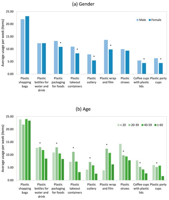 The analysis indicated that female respondents generally reported a slightly higher usage of plastic shopping bags, whereas male respondents exhibited greater consumption of plastic food packaging, takeout containers, plastic cutlery, plastic wrap and film, coffee cups, and plastic party cups. One possible explanation is that females are more frequently involved in daily shopping activities—such as purchasing fresh produce at local markets—while males are more likely to prefer and consume processed and convenience foods [56,57].