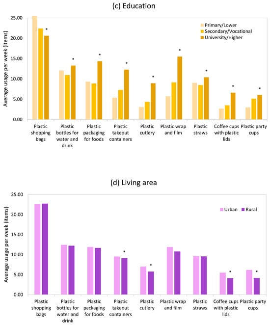 The impact of demographic factors on single-use plastic usage. (a) Gender, (b) age, (c) education, (d) living area; * denotes p < 0.05.