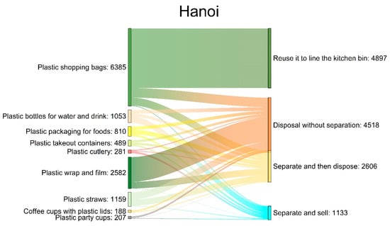 Disposal methods for each single-use plastic category in the five cities (items). The Sankey diagram shows the volume of each SUP category on the left and their disposal fates on the right—“Reuse to line the kitchen bin”, “Disposal without separation”, “Separate and then disposal”, and “Separate and sell”.