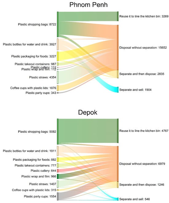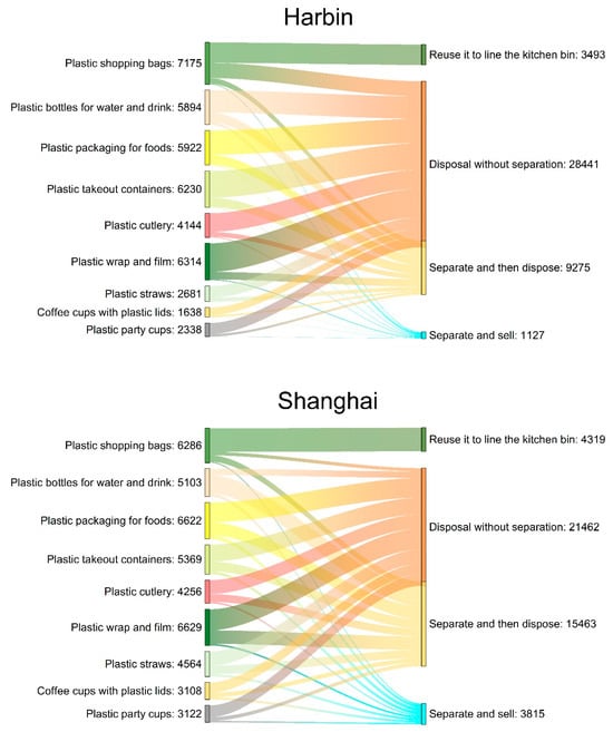 Figure 3 categorizes SUP disposal into four pathways: (1) reuse (applied only to plastic shopping bags reused as bin liners); (2) disposal without separation; (3) separation followed by disposal; and (4) separation for sale. The results reveal significant differences in waste management practices across the cities, as summarized below: