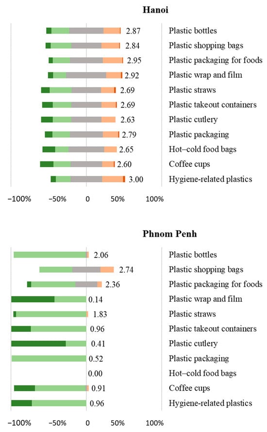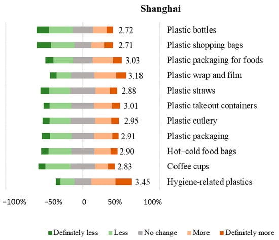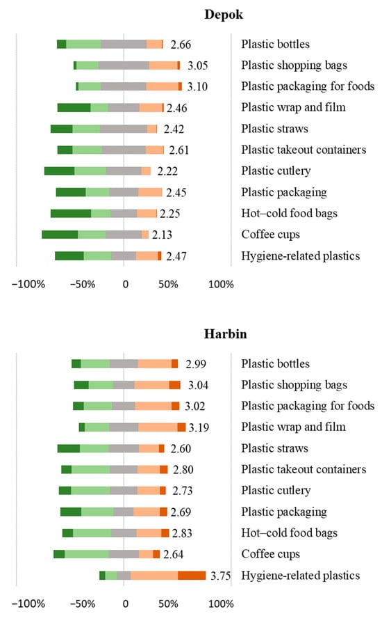 Figure 4 illustrates the changes in SUP consumption before and after the COVID-19 pandemic across the five surveyed cities. A Kruskal–Wallis test confirmed that the variation in SUP consumption changes across the cities was statistically significant (p < 0.05). In the figure, the bar length represents the number of respondents, while numerical values on the right side of each bar indicate the mean scores based on a five-point Likert scale (1 = “Definitely less”, 2 = “Less”, 3 = “No Change”, 4 = “More”, 5 = “Definitely more”). The midpoint of the horizontal axis (value = 3) indicates “No Change in Consumption”; values above 3 represent an overall increasing trend, while values below 3 indicate a decreasing trend.