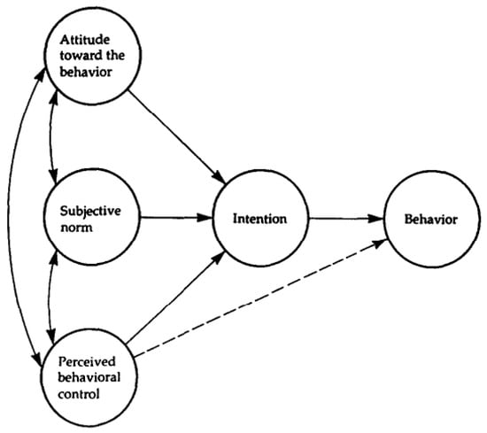 The Theory of Planned Behavior (TPB) asserts that behavioral intention is primarily influenced by three key variables: behavioral attitude, subjective norms, and perceived behavioral control [47]. According to this theory, an individual’s behavior is determined by their intention to engage in that behavior, which is shaped by their attitude toward the behavior, the subjective norms surrounding it, and their perceived control over the behavior [48]. Figure 1 illustrates this theory in a structural diagram.