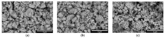 Figure 1 shows SEM images of the original ZrO2 powder, reflecting its states in the original (not milled) state, after mechanochemical milling and after thermal sintering. These images reflect the effect of mechanochemical grinding and thermal annealing on the change in the morphological features of the powders under study, which serve as the basis for creating ceramics. In the initial state, ZrO2 powders are clusters of fairly large particles of varying sizes and shapes due to the manufacturing processes (see data in Figure 1a). Mechanochemical grinding results in grain fragmentation and the formation of smaller agglomerates that do not have a clearly defined shape, as well as a low degree of crystallinity due to the deformation impact of the grinding bodies during grinding. Thermal annealing of the samples leads to the initialization of transformation processes associated with the formation of ZrO2 grains having an elongated spherical shape, while the sizes of the formed grains are quite close, without any strong scatter, which indicates that the thermal annealing process leads to the formation of single-phase grains with a monoclinic crystal structure (according to the X-ray phase analysis data presented in Figure 2).