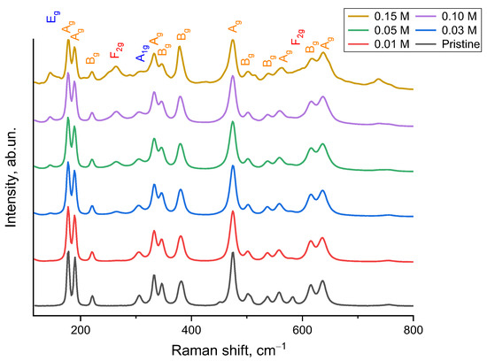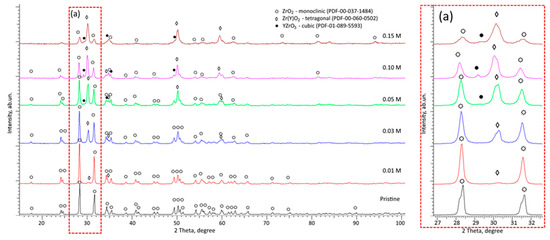 Addition of 0.01 M Y2O3 leads to the disappearance of the modes at 450 and 580 cm−1, which indicates a change in the defect structure, as well as the initialization of phase transformations in the samples associated with the stabilization of the crystal lattice. At a concentration of 0.03 Y2O3, peaks at 146 and 265 cm−1 appear in the spectra, corresponding to the tetragonal phase of Zr(Y)O2, while the broadened shape of the spectral lines, as well as their positions, indicate cationic substitution, confirming the results of X-ray phase analysis (see data in Figure 2) [29]. With a further increase in the Y2O3 concentration, an increase in the intensity of the modes characteristic of the tetragonal phase of Zr(Y)O2 is observed, which is in good agreement with the X-ray phase analysis data. At a content of 0.05–0.15 M Y2O3, in addition to the increase in intensity, additional low-intensity peaks appear at 206, 252, 288, 423 and 513 cm−1, the formation of which is due to the formation of the perovskite phase of YZrO3 with a cubic type of crystal lattice in the composition of the ceramics.
