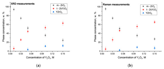 Based on the method of estimation of the weight contributions of each phase in the composition of ceramics, including determining the intensity and area values of diffraction peaks (in the case of X-ray phase analysis) and spectral modes (in the case of Raman spectroscopy), phase diagrams were constructed that reflect the change in the phase ratio in the composition of ceramics with variations in the concentration of the stabilizing additive Y2O3. The results are shown in Figure 4a,b. The calculation of inclusions of the phases formed in the composition of ceramics in the case of addition of Y2O3 to them was performed using the standard method of estimation of weight contributions. This method includes determination of the areas of all reflections characteristic of the established main and impurity phases with subsequent calculation of their contribution to the diffraction pattern or Raman spectrum. This method allows quite accurate determination of the change in phase composition in samples in the case of the formation of impurity inclusions, the content of which exceeds 0.1 wt.%.