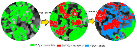 The overall view of the obtained dependences of the change in the weight contributions of various phases indicates that the addition of the stabilizing dopant Y2O3 in small quantities (0.01–0.05 M) leads to the formation of a small proportion of the tetragonal phase t-Zr(Y)O2, the weight contribution of which increases as the concentration of the stabilizing dopant in the composition of the ceramics grows. At a concentration of the stabilizing dopant Y2O3 in the composition, the observed formation of a contribution of the perovskite phase t-Zr(Y)O2 indicates an excess of yttrium ions in the composition of the ceramics, which leads to the formation of this phase, the content of which does not exceed 10–15% in the case of high concentrations of the dopant (0.1–0.15 M).