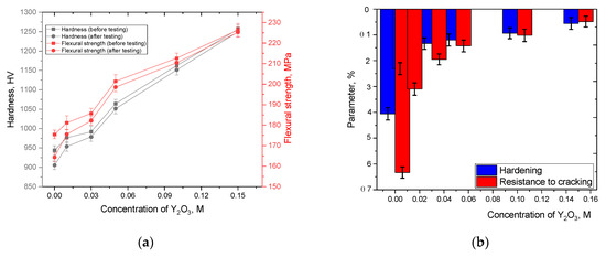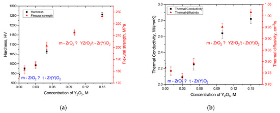 (a) Results of alterations in the values of hardness and flexural strength of ceramics depending on the concentration of the stabilizing dopant Y2O3; (b) results of alterations in the values of thermal conductivity and thermal diffusivity of ceramics depending on the concentration of the stabilizing dopant Y2O3.