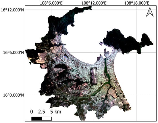 Da Nang, situated in a coastal area of South Central Vietnam, serves as a pivotal urban center due to its strategic location within the country. This region includes mountainous area in the west, coastal plain along the Han River, and the Hoang Sa Islands in the East Sea. The western and northwestern regions are dominated by high, steep mountains that extend toward the sea, while lower hills are scattered among narrow coastal plains [29]. Due to the research interest of UHI effect, this study focuses on the urban center of Da Nang (refer to Figure 1). The rural area of Hoa Vang district is used as the rural reference to evaluate the UHI in Da Nang.
