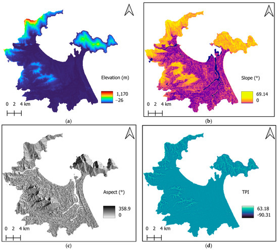 Explanatory variables play a crucial role in modeling the spatial variation in UHII. These variables encompass a range of factors that collectively influence thermal patterns within urban environments. Understanding these factors is essential for accurately predicting temperature variations. By combining these explanatory variables, robust data-driven models can be developed that capture the spatial and temporal variation in the UHI effect. Previous research has shown that topographic variables significantly influence surface temperature in urban areas [38,39]. Accordingly, this study employs elevation, slope, aspect, and the topographic position index (TPI) to describe the topographic characteristics of Da Nang’s urban center. The TPI evaluates the relative position of a point on the landscape in relation to the surrounding terrain; therefore, this feature is helpful for landform characterization [40]. Slope, aspect, and TPI calculations utilize the terrain module of GEE and the elevation data provided by the NASA SRTM Digital Elevation dataset. The four topographic variables examined in this study are illustrated in Figure 4a–d.