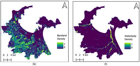 It is also noted that the variation in the density of built-up areas was proven to be the essential variable governing the UHI effect [44]. Xiao et al. [45] also confirmed that the cooling effects of green areas in urban environments were significantly influenced by the density of greenspace. Kafy et al. [46] also pointed out that the decrease in green cover has emerged as one of the most significant factors contributing to the increase in LST. Moreover, the spatial distribution of heat islands was shown to be dependent on the transformation of bareland to impervious surface [47]. Hence, this study relies on the densities of built-up areas (Figure 4i), greenspaces (Figure 4j), bareland (Figure 4k), and waterbodies (Figure 4l) to describe the characteristics of the urban landscape.
