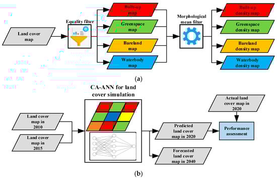 The proposed framework: (a) construction of density maps, (b) land cover simulation, and (c) machine learning-based UHII prediction.