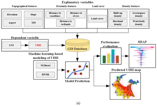 The proposed machine learning framework for spatial modeling of UHII is demonstrated in Figure 5c. This framework employs NGBoost and DNNR to elucidate the relationship between UHII and its explanatory variables. This framework integrates diverse data sources and advanced computational techniques, thereby providing a robust tool for analyzing and predicting variations in UHII. The primary goal of this analysis is to identify which algorithm achieves the highest accuracy in mapping UHII in the study area. Notably, NGBoost is implemented using the Python toolbox (Version 3.10) developed by Duan et al. [63]. The DNNR model is built in Python with the assistance of the Scikit-learn library [64]. Hyperparameters for all machine learning models are determined through cross-validation processes [65]. Additionally, the development and operation of these models are performed in Microsoft’s Visual Studio for Python programming environment. To assess prediction performance quantitatively, the metrics of RMSE, MAE, and R2 are employed.