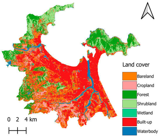 Waterbodies and wetlands have a significant cooling effect in urban areas [41,42,43]. As a result, the distance of land from coastlines, rivers, and wetlands greatly influences LST. This study takes into account the distances to coastlines, rivers, and wetlands, as illustrated in Figure 4e–g. Furthermore, land cover change serves as a major contributing factor to the UHI effect. Variations in the proportions of different land cover types have been shown to be the most influential factors affecting urban heat stress [18]. The land cover map, shown in Figure 4h, is compiled using classification results from the GLC_FCS30D global 30 m land cover change dataset. This map allows for the identification of pixels related to built-up areas, greenspaces, bareland, and waterbodies through equality filters. Morphological mean filters with a radius of 3 pixels are employed to generate the density maps. These data filtering operators are carried out in the GEE code editor.