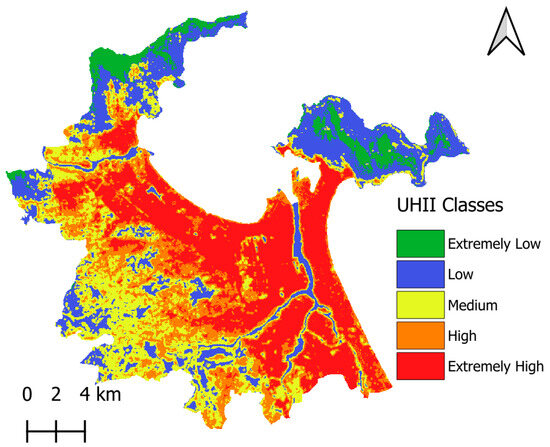 According to the computed UHII, a set of thresholds can be used to classify the intensity levels of the UHI effect [37]. The detailed UHI level (UHIL) is provided in Table 2. In general, the range of UHII is divided into five UHILs: extremely low (UHII ≤ 0), low (0 < UHII ≤ 0.1), medium (0.1 < UHII ≤ 0.2), high (0.2 < UHII ≤ 0.3), and extremely high (0.3 < UHII). The resulting maps of UHII and UHILs are presented in Figure 3a,b, respectively. Evaluating the intensity of the UHI effect and categorization of UHII are crucial for urban planning. Based on the spatial distribution of UHILs, local authorities can identify areas severely affected by heat stress for targeted interventions and improvement of urban heat comfort.