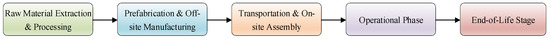 Life Cycle Segmentation: The entire life cycle of prefabricated steel buildings is delineated into distinct stages, including raw material extraction, manufacturing, transportation, on-site assembly, operational use, and end-of-life treatment;