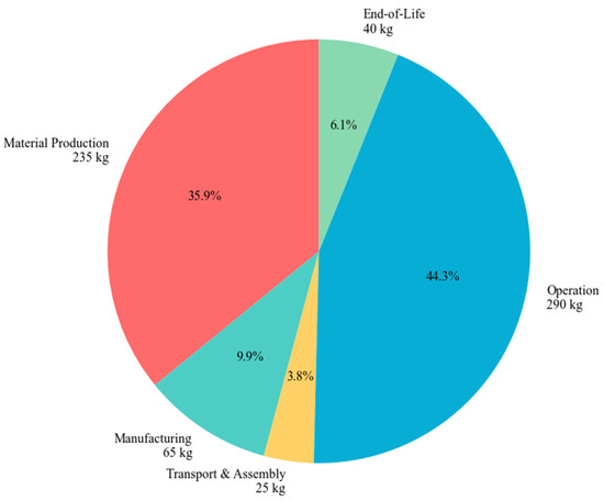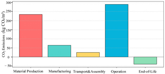 Figure 4 presents the proportional contribution of each stage to the total carbon footprint. The operational phase accounts for 44.3% of total emissions, followed by material production (35.9%), manufacturing (9.9%), and transport and assembly (3.8%). The end-of-life stage contributes a net reduction equivalent to 6.1% of total emissions.
