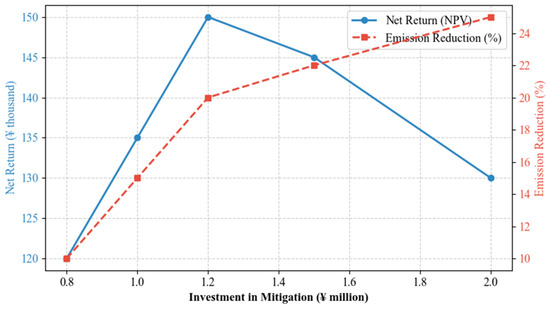 Figure 5 illustrates the relationship between mitigation investment levels and the corresponding net financial return (measured as the net present value, in thousands of CNY), as well as the percentage reduction in emissions. The financial return peaks at an investment level of CNY 1.2 million, corresponding to the baseline retrofit scenario. Beyond this point, diminishing marginal returns are observed, indicating an inflection point for cost-effective decarbonization investment. Emission reductions follow a similar curve, increasing with investment but tapering as the efficiency gains level off.