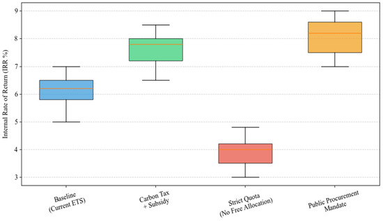 The results indicate that the strict quota scenario yields the lowest median IRR (~4%), reflecting the full cost burden of carbon compliance. In contrast, the carbon tax + subsidy and procurement mandate scenarios deliver significantly higher IRRs (exceeding 7.5%) due to incentive structures and assured market demand. The ETS baseline scenario results in a moderate IRR of approximately 6.2%.