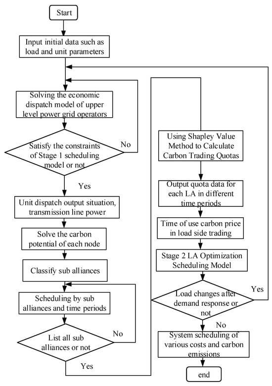 Both upper-level grid operators and lower-level LAs participate in carbon market trading. The upper-level power grid operator receives the carbon quota coefficient transmitted by the carbon trading platform and adjusts the unit output plan by calculating the generation cost and carbon trading cost. Based on the carbon flow tracking calculation, the node carbon potential is obtained, and the Shapley value carbon emission allocation method is used to reasonably allocate the load-side node carbon responsibility. By utilizing node carbon potential and time of use pricing strategies, the carbon quota responsibility value is transferred to the lower level LA of different nodes.