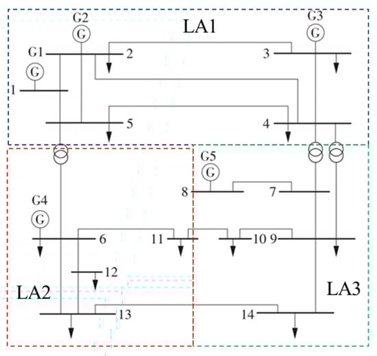 The Shapley value method is used to measure the carbon emissions of each LA. According to the improved IEEE 14 node system topology diagram, there are a total of three LAs in the quota calculation system, divided into regions LA1, LA2, and LA3. So, N = {LA1, LA2, LA3}. And there are six non-empty sub-alliances in the entire alliance. They are {LA1}, {LA2}, {LA3}, {LA1, LA2}, {LA1, LA3}, and {LA2, LA3}.