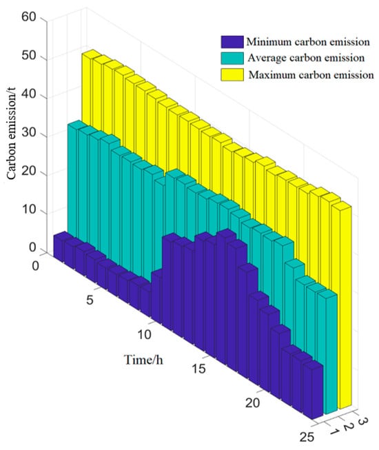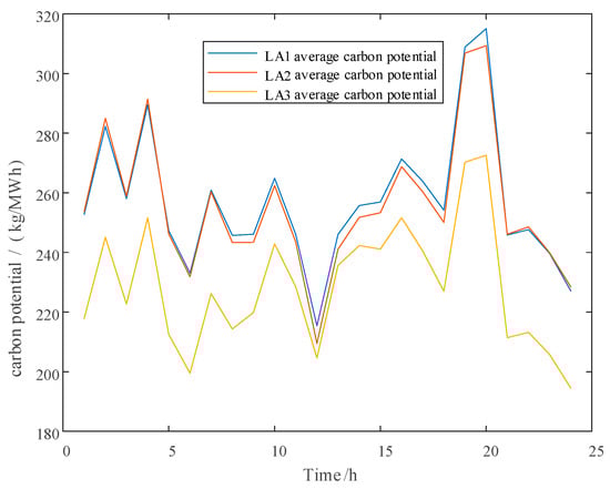 Figure 7 shows the average carbon potential size of each LA. It can be seen that the trend in carbon potential is basically the same, with a sudden increase in carbon potential between 16:00 and 23:00. This is because this time period is the peak-load period, and the clean energy output of the LA equipment decreases. Mainly powered by thermal power units, the carbon emission intensity of the units is much higher than that of gas-fired units and clean energy units. As a result, there is an increase in carbon potential during this period. The average carbon potential of LA1 is greater than that of LA2 and LA3. This is also a phenomenon caused by LA1 being in an industrial zone with high carbon emissions. Therefore, the carbon emission flow model can accurately reflect the carbon emission situation of the system and track the carbon emission footprint.