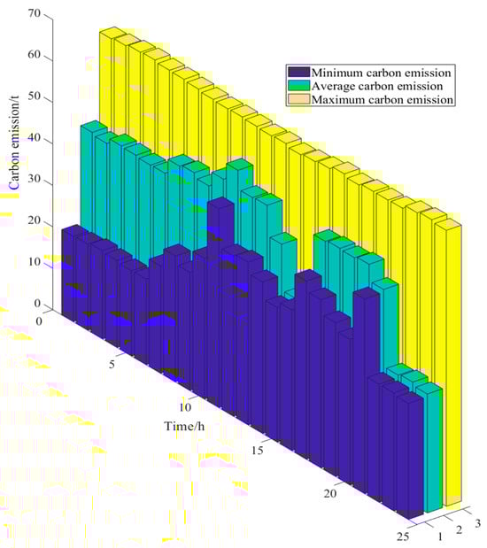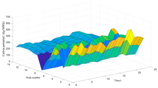The carbon emissions generated by the basic load of each node are mainly concentrated in nodes 2–4. The reason is that these nodes are relatively close to unit 1, which has the highest power generation and carbon emission factor, so the carbon emissions generated by the unit account for a significant proportion. The closer the node branch is to unit 1, the higher the carbon flow rate, the higher the carbon potential, and the higher the carbon emissions.
