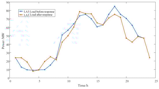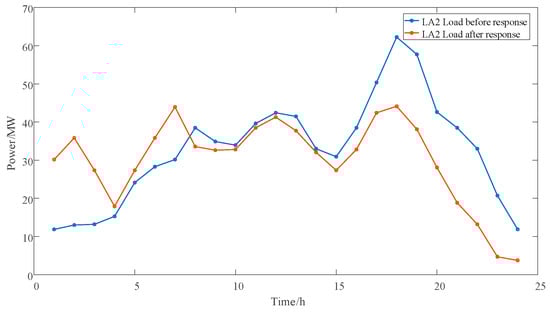 The load changes before and after the demand response of LA1, LA2, and LA3 are shown in Figure 8, Figure 9 and Figure 10, respectively. The pre-response load includes the original load curve and the EV unordered charging load. Due to the lack of optimized scheduling, EVs start charging immediately after being connected, resulting in a significant peak load. The peak–valley difference of the original load is relatively large. After the LA stimulates and schedules the flexible load, the EV is scheduled for orderly charging and discharging. This leads to load reduction and transfer, transferring the peak load of electricity consumption to the low-load period, reducing the electricity pressure during the peak-load period.