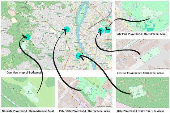 Playgrounds’ locations in different contextual settings in Budapest. Sources: https://www.openstreetmap.org (accessed on 2 May 2025).