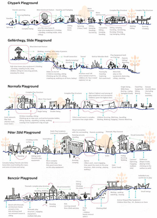 The five playgrounds—Citypark, Gellérthegy Slide, Normafa, Péter Zöld, and Benczúr—each feature distinct play equipment and structures that influence how children generally interact with them. Ziplines, complex equipment, swings, and slides are the most engaging, with children spending extended time running, climbing, and sliding. Thematic elements like climbing walls, tunnels, and dollhouses encourage exploration, hiding, and role-playing, while static toys and gates experience minimal use in terms of the interaction between children and those play features. Social dynamics vary among those play structures, with group play taking place around multi-functional equipment and quieter activities, like sitting or hiding, occurring near benches, sheltered spots, or corners. Parents often observe or socialise but occasionally join in on swings and seesaws with their children. These interaction patterns are visually summarized in Figure 3.