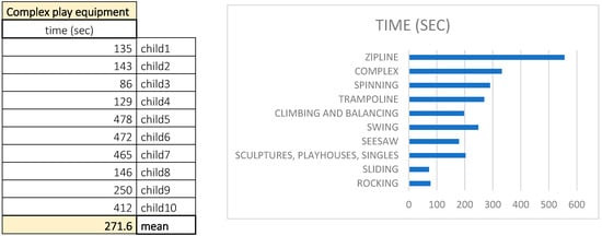 Among the children using play equipment, 10 children’s time per play equipment was documented, which became the average time spent on the play equipment.