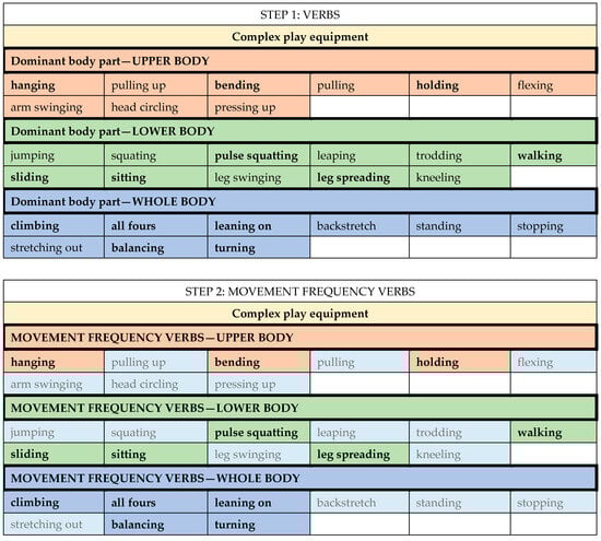 These types of actions represent a broad range of daily movements, encompassing both dynamic and static motions. During the data analysis, all the movement verbs recorded for each play equipment in the field survey were narrowed down to the list of the most common movement verbs (movement frequency verbs). The most common movement verbs described the movements that almost always occurred while using the play equipment, so these verb numbers represent the certainty.