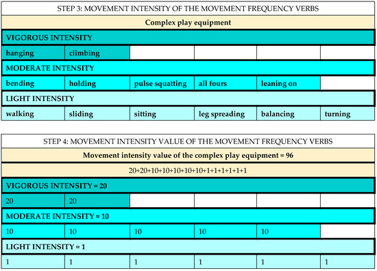 Movement intensity can be divided into three types: light, moderate, and vigorous. All three types may be repeated during the examination of a play equipment, so there may be several movement verbs that represent, for example, light intensity (walking, sitting, sliding, etc.).