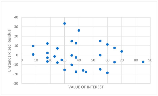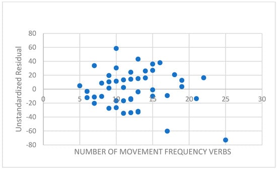 where beta0 (b0) is the intercept of the regression model, beta1 (b1) is the slope of the regression model, and the error is referring to the residual/error. The independency of the residuals formed a relatively irregular cloud as a function of x (the number of movement frequency verbs) as illustrated in Figure 6.