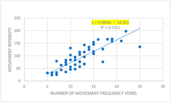 - R2 estimation and significance → the linear relationship between movement intensity and the number of main movement verbs was significant (R2 = 0.721; p < 0.001).