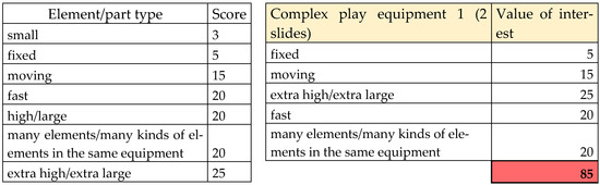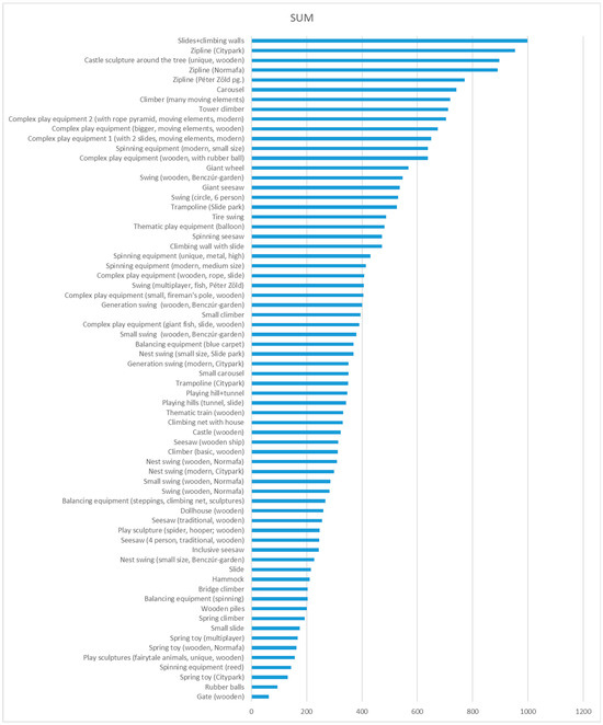 It is necessary to observe what makes a play device interesting or not interesting for a child. To understand play device interest for children, field surveys demonstrated that equipment with high, moving, or fast-moving elements was more engaging. These elements were scored based on children’s preferences (Figure 8), enabling identification of the most preferred features and equipment for the children.