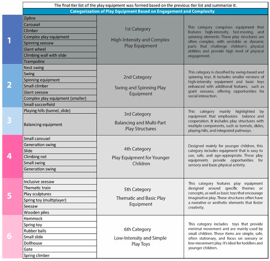 Our research aimed to systematically categorise play equipment levels of engagement based on multiple criteria, including time ranking, verb list ranking, and popularity among children. Through the observational and numerical analyses of these aspects, we identified six distinct categories of play equipment and their engagement levels among children. Each category was characterised by specific features, complexity, and usability patterns for different age groups. The results of this categorisation are presented below.