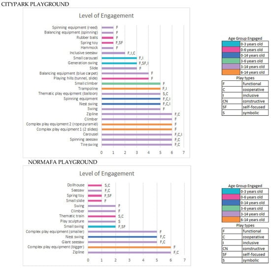 Figure 13 organises the play equipment by the type of engagement they provide, the level of engagement and its hierarchy among all the other equipment, and the age groups they were mostly engaged by. This gives a clearer view of how each piece of equipment can be utilised based on these factors. Light blue represents the ages between 0–3 years old, pink (0–6 years old), dark blue (0–14 years old), green (3–6 years old), purple (3–14 years old), lastly, orange represents ages between 6–14 years old.