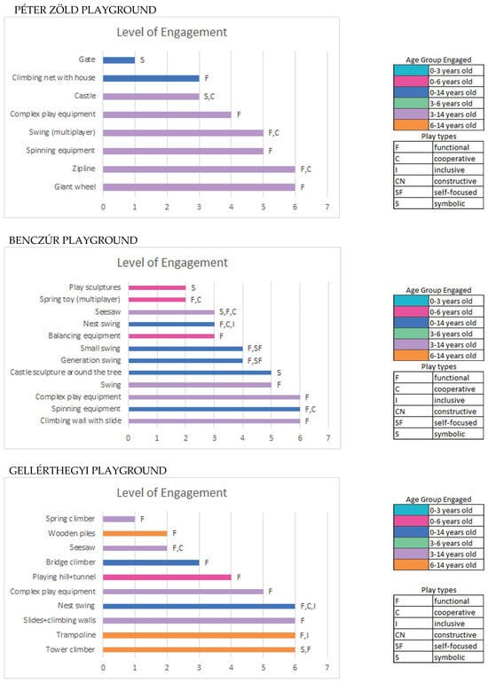 The analysis of level of engagement was a complex process, which was determined together with the previously listed analyses. Level of engagement was determined by how interesting the play equipment was (value of interest), how varied movement it caused (number of movement frequency verbs), and how much time children spent on it; at the same time, the characteristics and needs of different age groups also played a role in which play equipment became more popular among children. The values of the analyses listed above were summarised, classified into different categories, and then represented as patterns for each playground, showing the age groups engaged next to them.