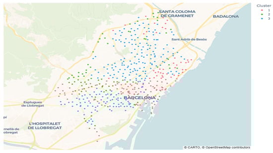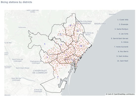While the data provided by the Barcelona open data portal on the Bicing service are extensive, these are insufficient to fully meet this study’s objectives. For this reason, additional sources were incorporated. The rationale for using these auxiliary datasets is outlined below. For instance, Figure 1 illustrates the distribution of stations by district. Although the open data portal provides the postal code (CP) for each station, it does not directly indicate its corresponding district. To bridge this gap, the Barcelona GeoPortal [], which offers detailed geospatial information about the city, was used. Additionally, while the open data portal provides the population count for each district, it does not break this information down by postal code, and certain postal codes span multiple districts. By leveraging GeoPortal, it was possible to establish relationships between population, station locations, and districts, enabling a more detailed descriptive analysis.