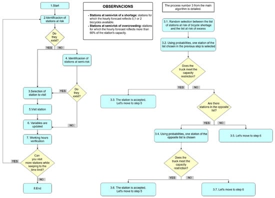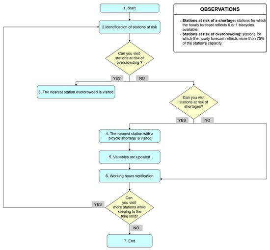 In the field of route optimization, the nearest neighbor algorithm is widely used to construct efficient solutions. In this study, an adapted version is applied to the Bicing system. Figure 2 outlines the steps followed, integrating the necessary modifications for this specific problem.