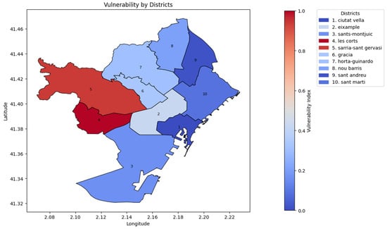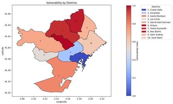 For the calculation of this metric, the values of each variable, ,  and  were previously normalized. This normalization ensures that the values of the different variables are comparable to each other and that there are no biases derived from the original scales since all the values are located around the same standardized range. Once the vulnerability index was calculated for each district, an additional transformation was applied using the Min–Max scaling method, which adjusts the values obtained to be in a range between 0 and 1. This scale facilitates the interpretation of the results since the values closer to 1 represent the districts with the greatest vulnerability, while the values close to 0 represent the least vulnerable districts within the bike-sharing system.