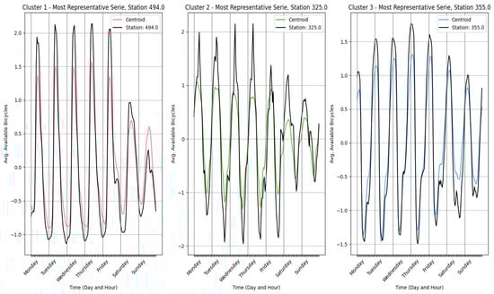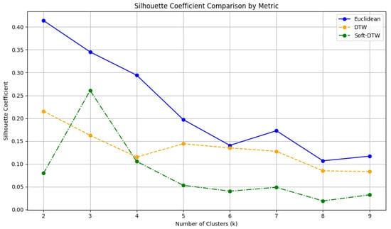 For the implementation of this method, the tslearn library [] is used, specifically the TimeSeriesKMeans method of tslearn.clustering. It should be noted that this method can calculate groups using three options for comparison: Euclidean distance, Dynamic Time Warping (DTW) algorithm and relaxed DTW algorithm. The key advantage of DTW and soft-DTW over Euclidean distance is that DTW allows for the alignment of sequences with different lengths or temporal shifts by dynamically warping the time axis. This makes it possible to capture similar patterns even if they are out of phase over time. In contrast, Euclidean distance strictly compares corresponding points in time, making it sensitive to misalignments and variations in the timing of patterns. However, in the case studied, there is no time lag; therefore, any of the options can be used. The time lag is eliminated in data preprocessing. For greater representation, the original time series, defined over the entire period, is not used. For each series, the hourly average on each day of the week is calculated. By averaging the values by hour and day, daily variations that are not significant for long-term analysis are eliminated, thus achieving a more representative series of the general patterns and eliminating possible noise. The silhouette coefficient is also employed to evaluate and compare the performance of each variant of the TimeSeriesKMeans method, guiding the selection of the most suitable algorithm for the clustering task.