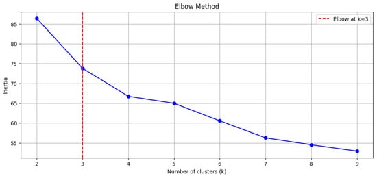 where  is a data point,  is the centroid of cluster ,  is the cluster ,  is the number of clusters and  is the distance used to compute the sum. As the number of clusters increases, inertia decreases, but the marginal gain diminishes. The Elbow Method involves plotting inertia against the number of clusters and identifying the point at which the rate of decrease sharply changes—the so-called “elbow”. In this study, a 10% inertia reduction threshold is applied to guide this selection.