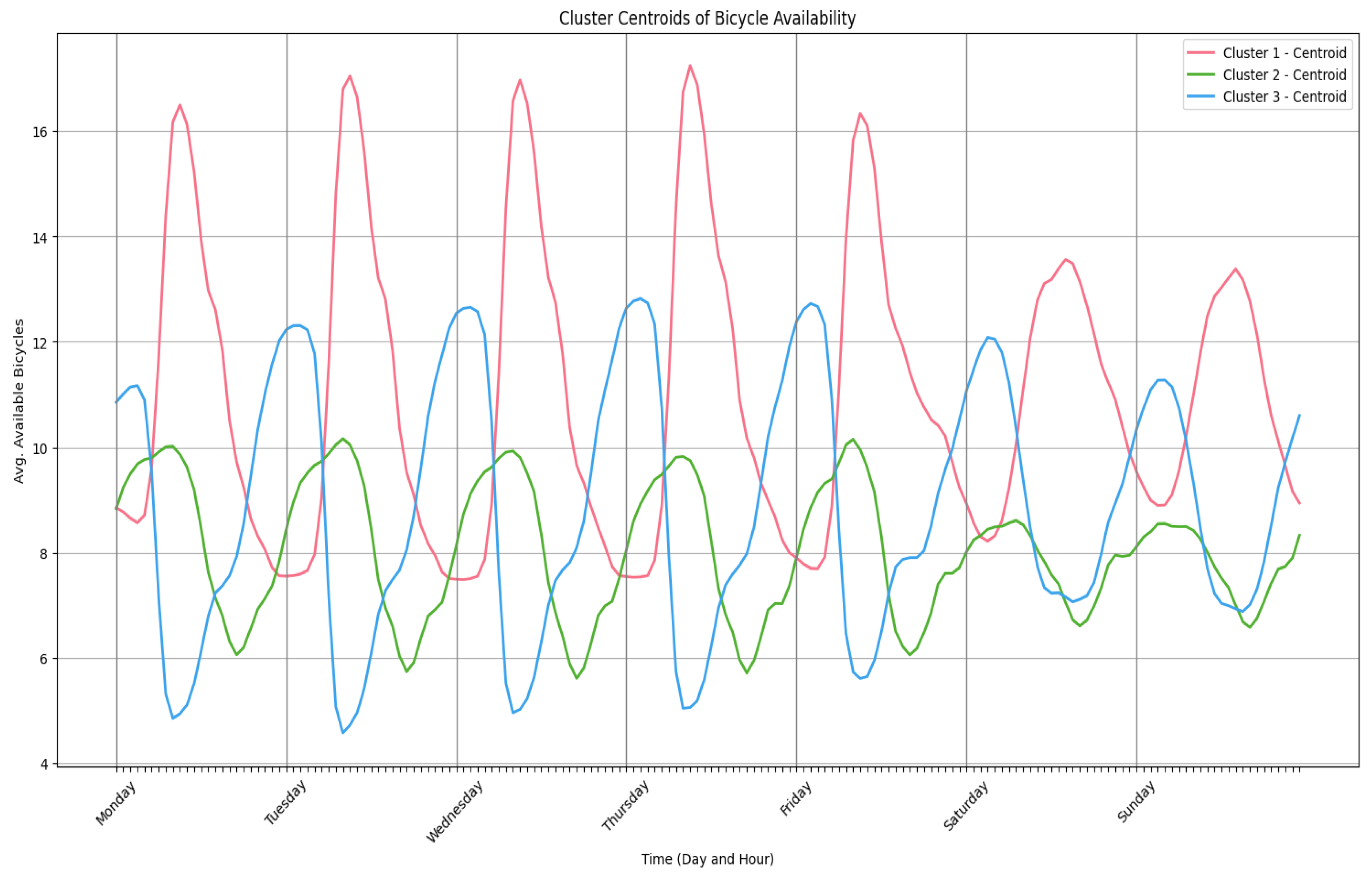 The first and third clusters exhibit opposite behaviors in terms of bicycle availability: when stations in cluster 3 are overcrowded, those in cluster 1 are empty, and vice versa. In contrast, cluster 2 stations display more stable usage patterns with fewer fluctuations, indicating balanced demand.