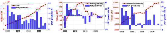 Due to the unavailability of real GDP data adjusted for price deflators—particularly the historical inflation indices for Shanghai’s three industry sectors—this study analyzes Shanghai’s economic growth over the past two decades (2004–2023) using annual nominal GDP totals and their components from three industries and twelve segmented fields. The raw nominal GDP data (2004–2023) were obtained from the Shanghai Municipal Bureau of Statistics https://tjj.sh.gov.cn/ (accessed on 1 January 2025). Sectoral contributions (e.g., primary, secondary, tertiary industries) were calculated by aggregating the official subsector data, adjusted for consistency with China’s national accounting standards [18]. Notably, the total GDP contains three industry components: primary industry (i.e., agriculture, forestry, fishing, mining, and oil extraction, etc.), secondary industry (i.e., manufacturing, construction, and energy production, etc.), and tertiary industry (known as service industry), respectively. The twelve segmented fields specifically include industry and construction (belonging to secondary industry), wholesale and retail industry, transportation, storage and postal services, accommodation and catering, information transmission, software and information technology services, finance and real estate (belonging to tertiary industry).