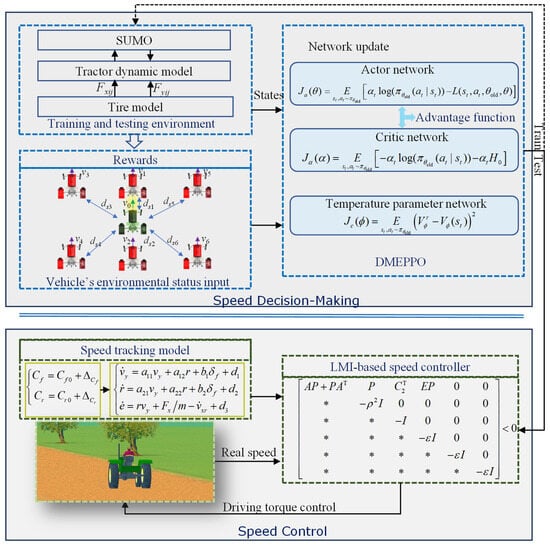 The hierarchical speed decision control framework (DMEPPO + LMI) proposed in this study not only solves the technical challenge of multi-objective dynamic optimization but also provides a practical solution for the sustainable development of agriculture. First, through the integrated optimization of the operation efficiency and energy consumption using a deep reinforcement learning algorithm (DMEPPO), the system is able to autonomously select the optimal speed target in a dynamic environment, which significantly reduces fuel consumption (e.g., simulation experiments showed that the energy consumption was reduced by about 30%) and thus reduces the carbon emissions and operation costs. Secondly, the robust control layer (LMI) ensures the smoothness of the vehicle’s driving by suppressing the uncertainty of disturbances in the complex environment of a field, prolonging the service life of mechanical parts, and reducing the wear and tear of equipment and the need for maintenance due to frequent acceleration or braking. In addition, the introduction of the safety distance reward mechanism effectively avoids the risk of collision in multi-machine cooperation, improves operational safety, and further ensures the high efficiency and resource-saving capability of agricultural production. These innovative designs not only meet the demand for intelligence and precision in modern agriculture but also provide technical support for the development of low-carbon and green agriculture, which is in line with the strategic goal of the sustainable development of global agriculture.