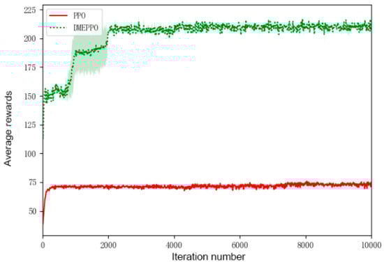 As can be seen from Figure 3, the system employing DMEPPO gradually reached convergence and stability at 2000 steps with a score of about 210 and experienced two jumps out of the local optimum at about 800 and 2000 steps, which illustrates the fact that with the introduction of the entropy constraints, the system employing DMEPPO had a better exploratory capability and thus achieved a final score of over 200. In contrast, the system using PPO was trained to obtain a locally optimal result at the beginning and increasingly favored that result, which ultimately led to a locally optimal strategy being obtained, and its final score was 75.